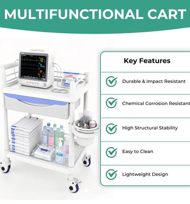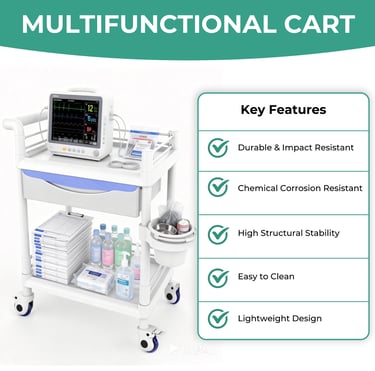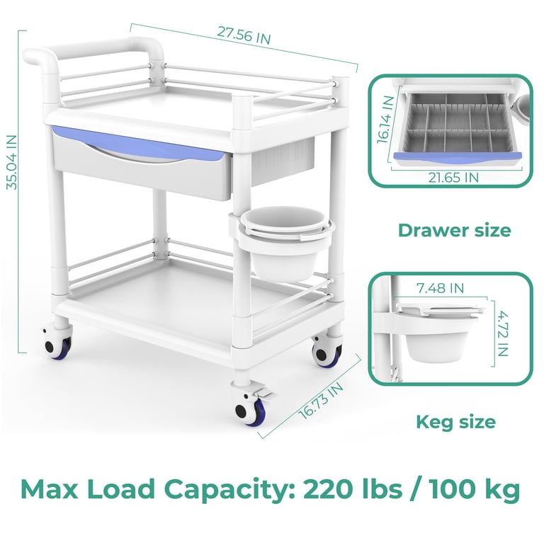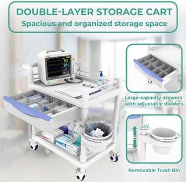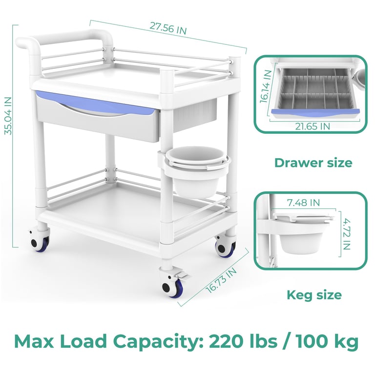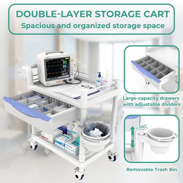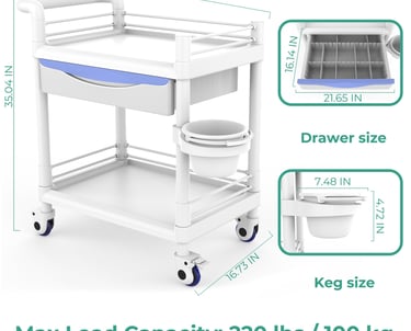 Bravique 2-Tier Rolling Utility Cart with XL Divided Drawer, Workstation Cart with Quiet Lockable Wheels, Adjustable Side Cup/Bin, 400 lb Capacity, White